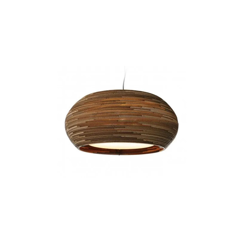 Graypants Ohio er en pendel fremstillet af genbrugt bølgepap og glas. Glasset giver lampen et roligt udtryk, der står i kontrast til det spændende mønster, der dannes af bølgepappet.Pendlen er samlet i hånden og laserskåret, og kan derfor variere i størrelse.Lille: Ø 61 H 24 cm.Stor: Ø 82 H 33 cm. Ledning: 2 meter sort stofledning Fatning: E27